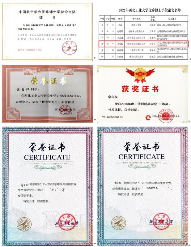 求索路途,勇毅前行。博士期间,聚焦集群无人机容错协同控制领域中的关键技术难题,他勤于思考,善于创新。在科研道路上,灵感迸发瞬间的背后,是长时间的积累与思考,遇到科研难题他毫不畏惧,坚定信念,敢于向未知领域的前沿技术发起挑战。在一次又一次的磨练中,他始终秉承母校直播平台 “公诚勇毅”校训,不断践行科创使命,最终取得了较为丰硕的研究成果,荣获多项奖励表彰。