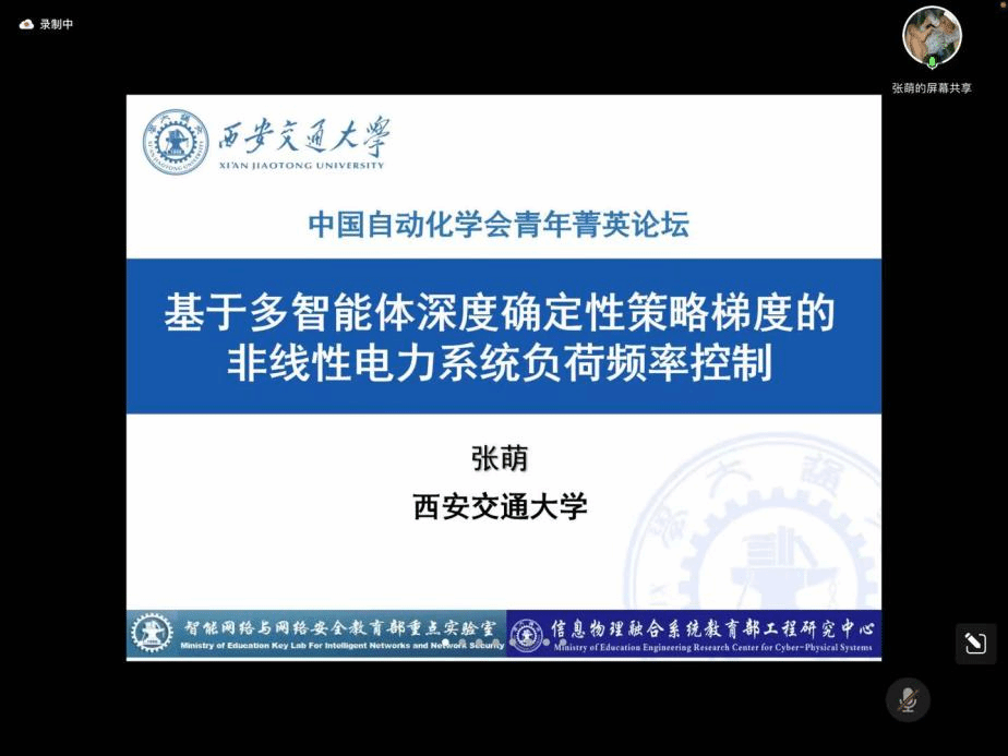 的李慧平教授做了题为“海洋航行器模型预测控制”的学术报告,西安电子科技大学的郑元世教授做了题为“基于博弈的多智能体系统协同控制”的学术报告,国网青海省电力公司清洁能源发展研究院新能源产业发展研究中心的杨立滨副主任做了题为“基于电池储能的新能源送端电网暂态能量控制及储能优化方法研究”的学术报告,西安交通大学的张萌副教授做了题为“基于多智能体深度确定性策略梯度的非线性电力系统频率控制”的学术报告,国网陕西省电力有限公司电力科学研究院电源技术中心的王若谷副主任做了题为“含高比例新能源的电力系统优化运行与控制技术研究”的学术报告,新疆大学的于志永副教授做了题为“几类多智能体系统一致性及分布式优化控制方法”的学术报告。