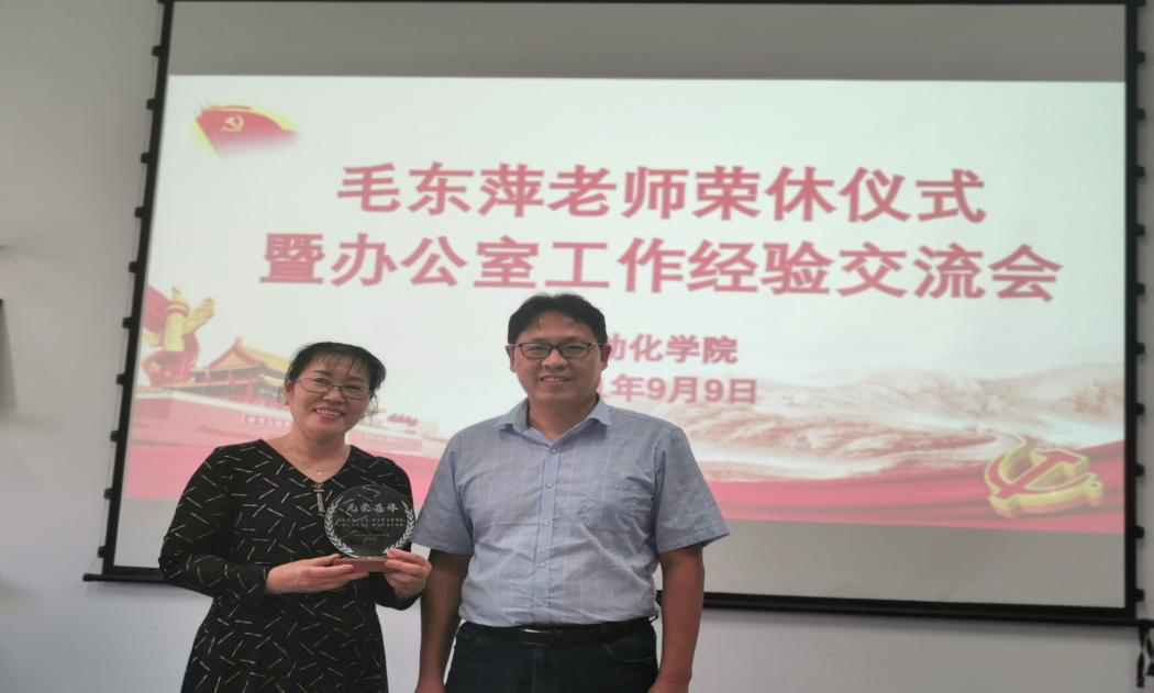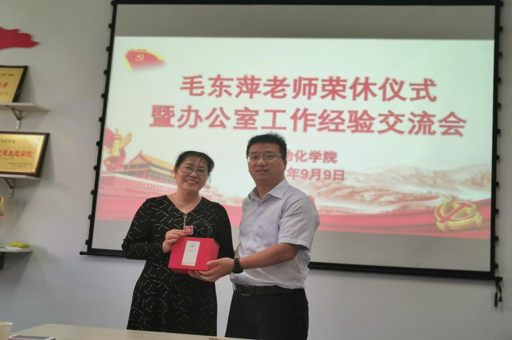 仪式由办公室主任魏爱玉老师主持。首先,王小旭副院长、刘准钆副院长、许斌副院长分别为毛老师颁发奖杯、赠送鲜花、赠送纪念品。