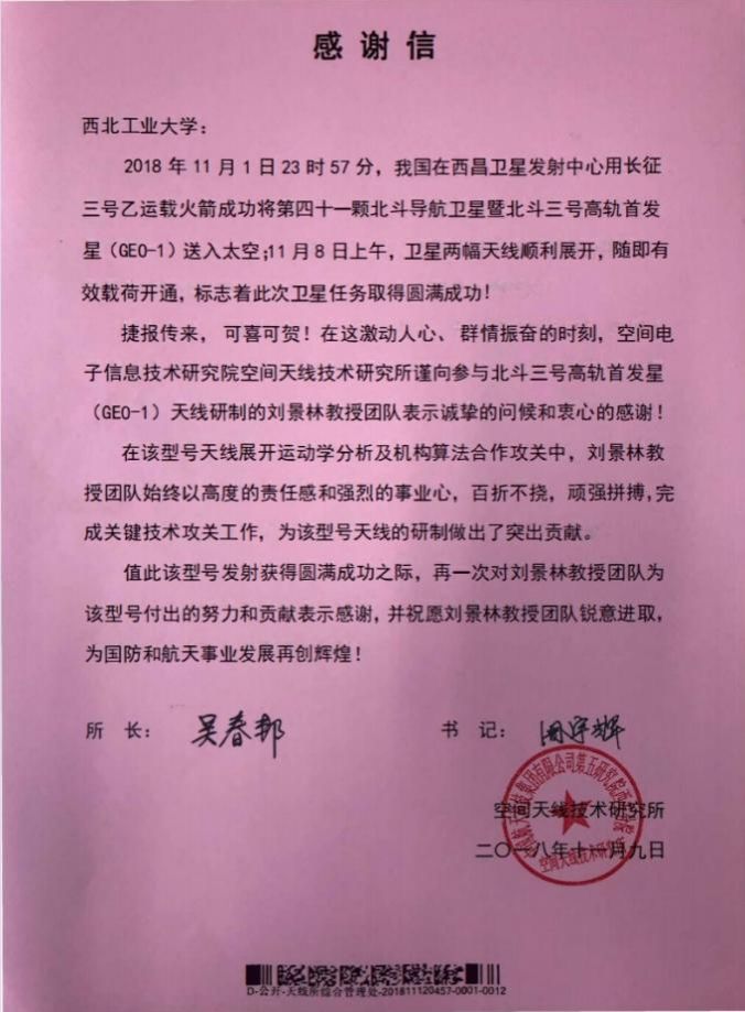 2018年11月1日23时57分,我国在西昌卫星发射中心用长征三号乙运载火箭,成功发射了第四十一颗北斗导航卫星暨北斗三号高轨首发星(GEO-1)。该卫星发射成功后,中国空间技术研究院西安分院特地发来感谢信,对刘景林教授团队在卫星天线驱动系统研制中所作的突出贡献表示了感谢。