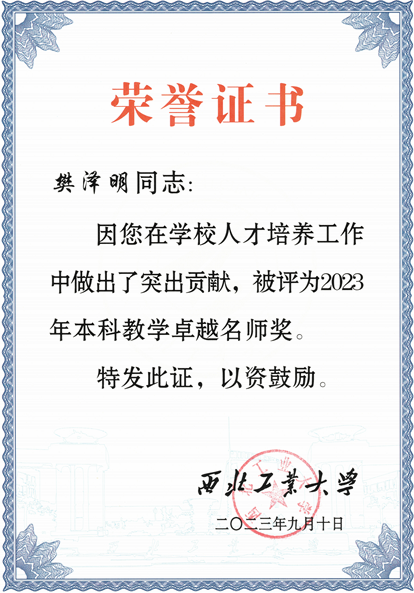 砥砺深耕,屡创佳绩。从教18年,樊泽明教授先后荣获本科卓越名师奖、最满意教师、“三育人”先进个人、先进工作者、优秀共产党员等多个称号;领衔建成的“机器人工程”专业获国家级一流专业,2023年“软科”排名层次为A+、全国排名名次第6;主持建成的5门课程分别获校、省、国家级一流课程,主编的3部教材获省级以上规划教材;教学研究关键技术获省高校科学技术奖1项;育人成果获省级教学成果奖2项,校级教学成果奖5项,获校级优秀教学研究一等奖1项。