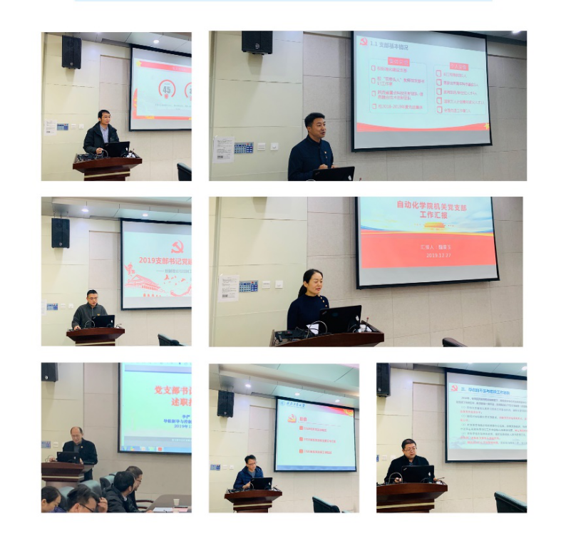 7个教工党支部按照抽签顺序依次开展2019年度党建工作述职,主要从学习习近平新时代中国特色社会主义思想理论体系、“三会一课”开展情况、师德师风建设情况、宣传文化工作、统一战线工作、支部制度建设、党风廉政学习教育情况、“不忘初心、牢记使命”主题教育开展情况等多个方面进行工作内容阐述;学院7个教工党支部在认真准备述职内容前提下,全面展示了支部全年工作情况,剖析现有问题并制定2020年工作计划。