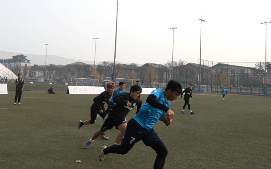 橄榄球代表队对阵中国农业大学的幺幺玖-兽刃联队。队员们稳扎稳打,在防守上寸步不让,步步紧逼,不断向对方进攻队员施压。比赛进行到一半时,李左与梁代福巧妙配合接球突破,顺利拿下一分。这场比赛最终以1:1战平,直播平台