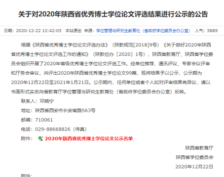 根据《陕西省优秀博士学位论文评选办法》(陕教规范[2018]9号)和《关于做好2020年陕西省优秀博士学位论文评选工作的通知》(陕教位办〔2020〕1号)文件精神,陕西省教育厅和陕西省学位委员会组织开展了2020年省级优秀博士学位论文评选工作。经单位推荐、通讯评议、专家会议评审和厅务会审议,直播平台