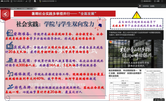 团委学生兼职副书记王崔骁同学以《盛夏躬行淬真知,沃土砺剑展锋芒》为题,系统回顾了学院暑期社会实践的整体成果。从前期动员到安全教育,从精准立项到成果展示,学院实践工作实现了“系统化、优质化、品牌化”的全面提升。