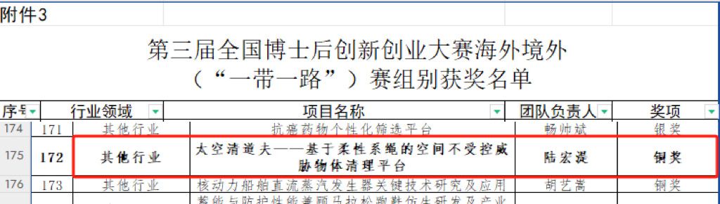 空间系绳与飞行器控制团队成员参赛项目《太空清道夫-基于柔性系绳的空间不受控威胁物体清理平台》,荣获第三届全国博士后创新创业大赛“海外境外”(“一带一路”)赛的“其他行业”赛道铜奖,这也是学院首次在该项全国性高水平赛事中获此佳绩。