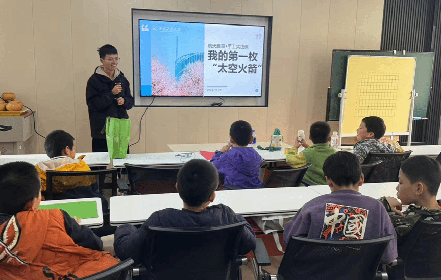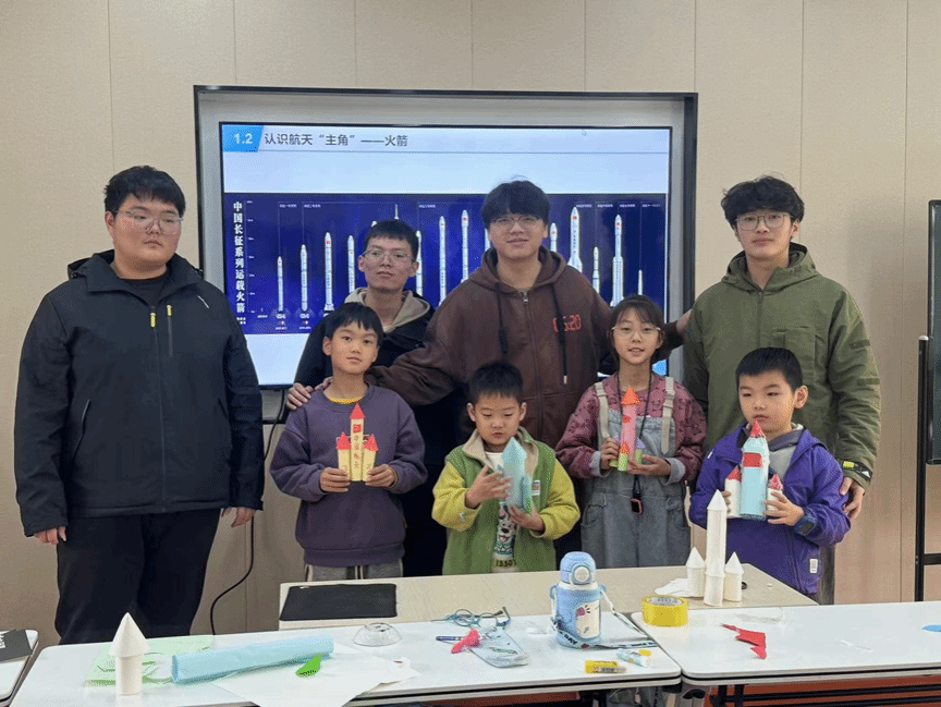 志愿者龙睿骞、罗啸天、王佳杰、牛超文于近期再次走进社区,带来了以“三航科普课——我的第一枚太空火箭”为主题的又一堂科普课。本次课程以“科普讲解+趣味手工”为主要形式,通过生动的课堂讲授与互动体验,让小朋友们在轻松愉快的氛围中了解航天知识。