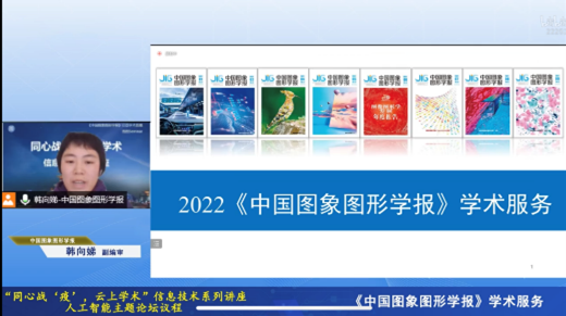 中国图象图形学报副编审韩向娣详细介绍了学报2022年持续推出的学术服务,一是免费公益学术讲座资源直播活动,二是免费学术学科资源,三是“同心战疫云上学术”信息技术系列讲座。