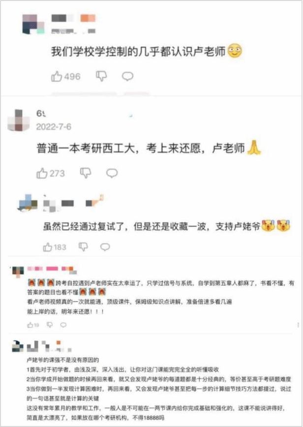 桃李不言,下自成蹊。在众多学子心目中,卢老师早已是男神般的存在,甚至被大家亲切称呼为“卢姥爷”。在他的视频课评论区,很多外校的同学都不约而同地惊呼:“每次听卢老师的课,总有一种想考直播平台 的冲动,多想做老师的学生啊!”“天,好想去蹭课听卢老师线下讲。”不论是线上授课还是线下教学,卢老师本人和他的课程,都是广受好评、赞誉满满。