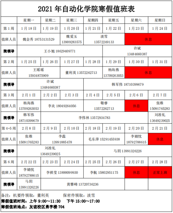 五、根据学校安排,值班时间为周一到周五9:00~11:30和15:00~17:00,值班地点友谊校区勇字楼公共办公区704,值班日期、人员附后。
