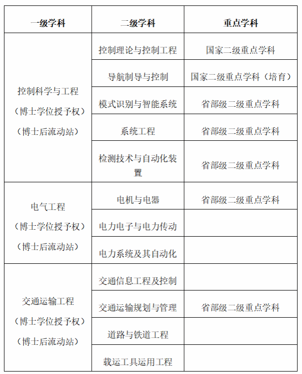 学院拥有控制科学与工程、电气工程、交通运输工程3个一级学科,其中控制科学与工程学科在全国第五轮一级学科评估中成绩优异,取得历史性突破;拥有电子信息(控制工程、仪器仪表工程、人工智能)、能源动力(电气工程)、交通运输(道路交通运输、航空交通运输)、机械(机器人工程)等专业学位领域;设有3个博士后流动站。