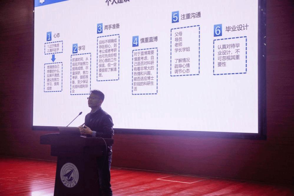 最后,谭博天聚焦毕业去向问题,对考研、就业、创业等不同发展道路进行了详细的分析,并结合自己当年的考研经验,为同学们指明方向。希望大家通过本次大会尽早明确升学就业目标,提早认真谋划,全力以赴、积极准备保研、考研、就业相关工作。