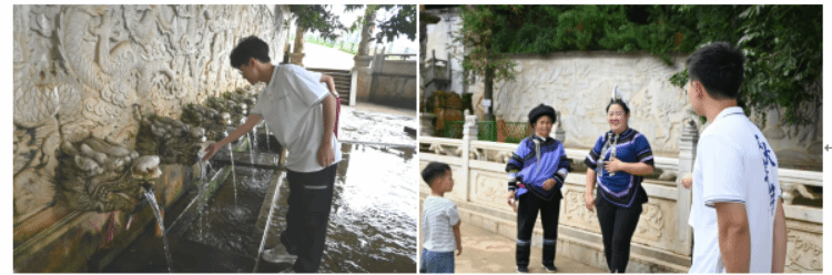 接下来,实践队步入隐于梯田云海的康藤·红河谷帐篷营地,这里将梯田景观、哈尼蘑菇房元素融入野奢设计,吸引了各地的游客入住。营地管家向队员们介绍:“17顶帐篷的客房年均入住率可达80%。”循着水声,实践队探访了甲寅镇西北4公里处的他撒十二龙泉。今日泉眼仍涌清流,石槽分水如故,代表着哈尼人对平等与幸福的永恒守望。