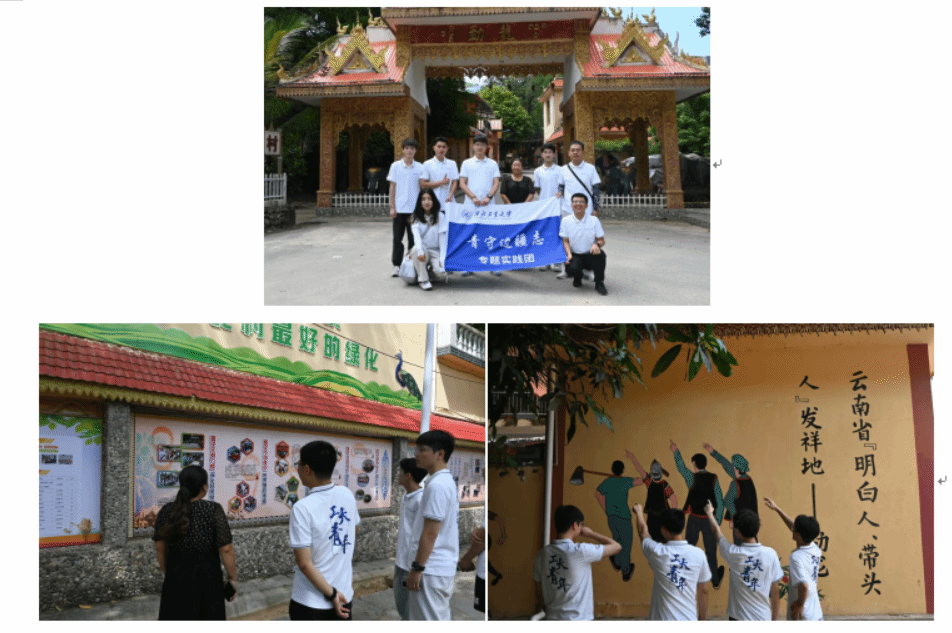 实践队抵达红河县后,首站便来到以傣族为主体的勐龙村。这里不仅是全国文明村,更是云南省美丽乡村建设的典范。村委会深入组织“五个普及”“三话六学”活动,创新落实“一联三会四落实”工作方法,不断强化基层思想政治建设,为高质量发展注入动力。村委会成员白海仙带领队员们参观了民族团结公约墙和村史馆,并细致讲解了这座大山深处傣族村寨独特的风俗习惯与发展脉络。队员们积极提问,就傣族文化的传承发展与白老师展开了详细讨论。