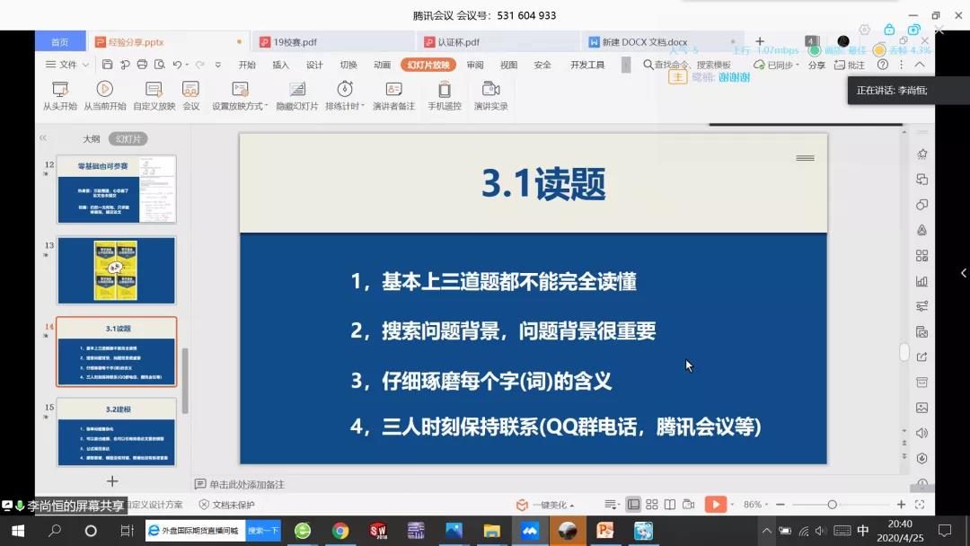 接下来进行分享的是18级的李尚恒同学。他就“什么是数学建模”、“如何准备数学建模”以及“我的校赛经历”为同学们介绍了他对与数学建模的理解,以及他如何从零基础到逐渐成为优秀的数模选手的过程。在分享会上,他以分享屏幕的形式对于表格绘制的好处,如何输入公式等细节进行了演示,十分耐心。部分同学也根据自己在分享会上的学习所得表达了自己的学习感受。