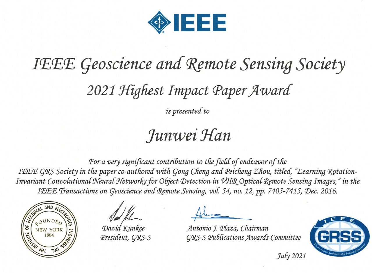 脑与人工智能研究团队韩军伟、程塨教授等合著的论文“Learning rotation-invariant convolutional neural networks for object detection in VHR optical remote sensing images”获得2021年度IEEE地球科学与遥感学会最有影响力论文奖(IEEE GRSS Highest Impact Paper Award)。该奖项由IEEE GRSS(IEEE地球科学与遥感学会)设立,是遥感领域最有影响的论文奖项之一,每年颁发1次,从约8000篇论文中评选而出,旨在奖励过去5年发表在IEEE GRSS主办的3个SCI期刊上(IEEE TGRS、IEEE JSTARS、IEEE GRSL)引用次数最多、影响力最大的学术论文(received the highest number of citations and impact over the past 5 years)。直播平台